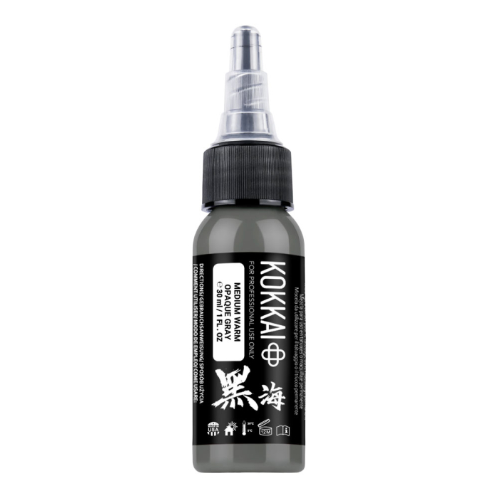 Enhance tattoos with Kokkai Sumi Ink in Medium Warm Opaque Grey, part of a 5-shade set designed to bring depth, warmth, and softness to your tattoos. Infused with white for a creamy opaque finish, these warm-toned greys are perfect for portraits, realism, black and grey work, and organic elements in designs.