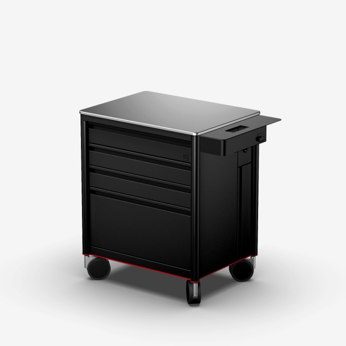 It has a lot of storage capacity: one large 33cm high drawer for large items, three smaller ones and one at the side which can hold up to 108 ink bottles. The four drawers at the front can be customised to suit your preferences. The smooth worktop is big enough to keep everything you need on it and is easy to clean. The four electrical sockets and 2 USB ports will power all your tattoo equipment. The Meta Workstation is completely made out of aluminium.