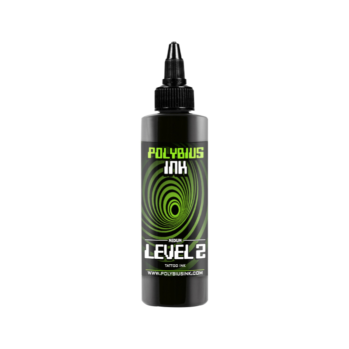 Medium Level 2 from Polybius Ink is a medium grey tattoo ink that's perfect for transitioning between light and dark areas. It can be used alone or diluted with Level 0.