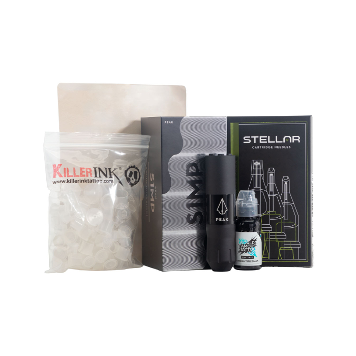 Containing a pen-style tattoo machine with wireless battery pack, black ink and ink cups, cartridges and a sheet of practice skin, so you can begin practising straight away. Everything in this kit is sold individually on the Killer Ink site so you can refill it as necessary.